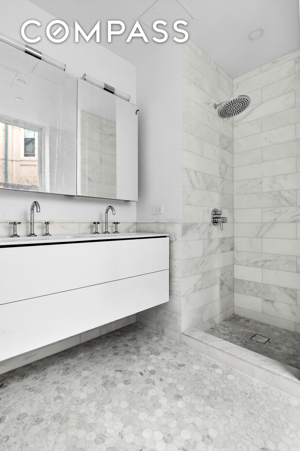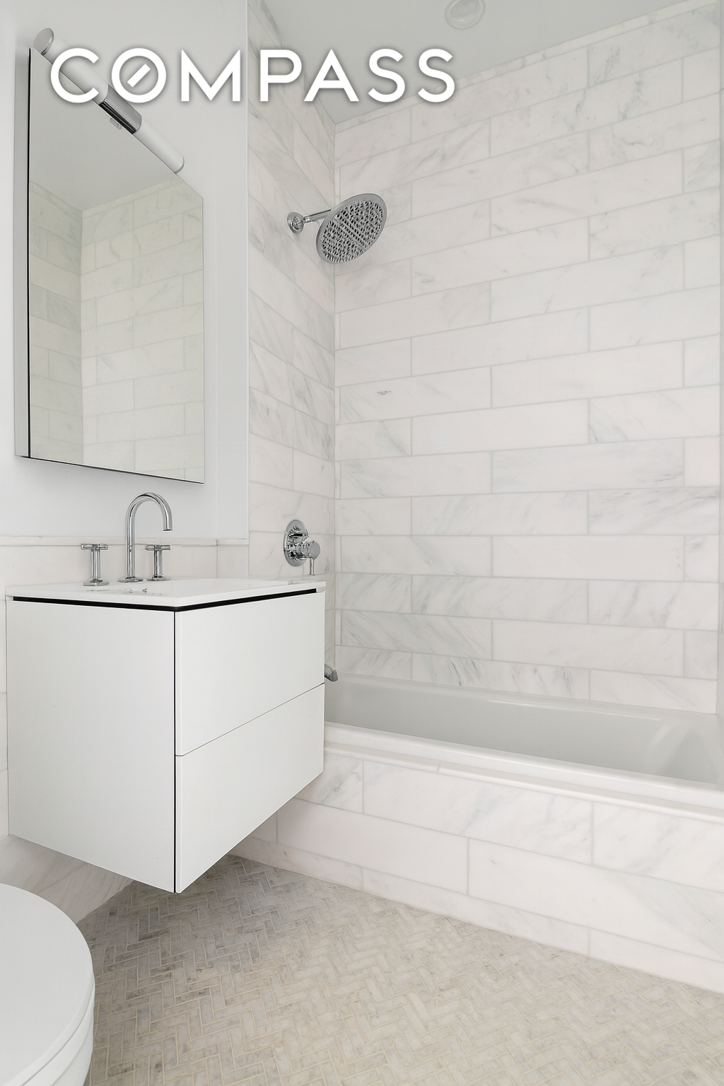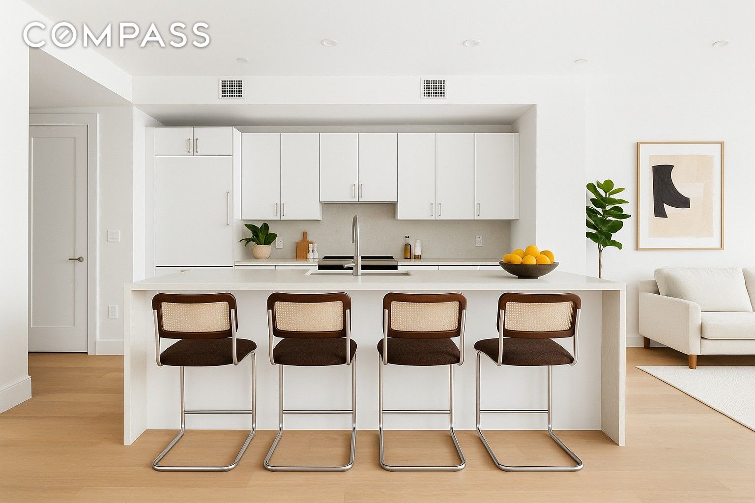 Upon entry, experience the best in open-concept living with a great room that provides plenty of space to comfortably stage a living area. This perfect haven for everyday living and entertaining also features a dedicated and distinct area for formal dining. The open-style chef's kitchen is appointed with sleek white cabinetry, quartz countertops and backsplashes, a Grohe faucet, an Elkay kitchen sink, a Miele hood, and a top-of-the-line Miele appliance package, including an oversized refrigerator with a double drawer freezer, an electric cooktop, a wall oven, and a dishwasher. The well-proportioned primary bedroom accommodates a king-size bed and more, and includes a generously sized built-in closet for ample storage. The spa-like en-suite marble bathroom is outfitted with double sinks and vanities, Brizio fixtures, and a large shower stall. The secondary bedroom includes a well-sized closet and maintains excellent natural light. It is located near a spacious, windowed marble bathroom with intricately woven marble tile floors, double sinks with Duravit vanities, a deep Kohler soaking tub with Brizio tub and shower controls, and a Toto toilet. A stackable washer and dryer are located in the basement, completing the functional layout of this home.