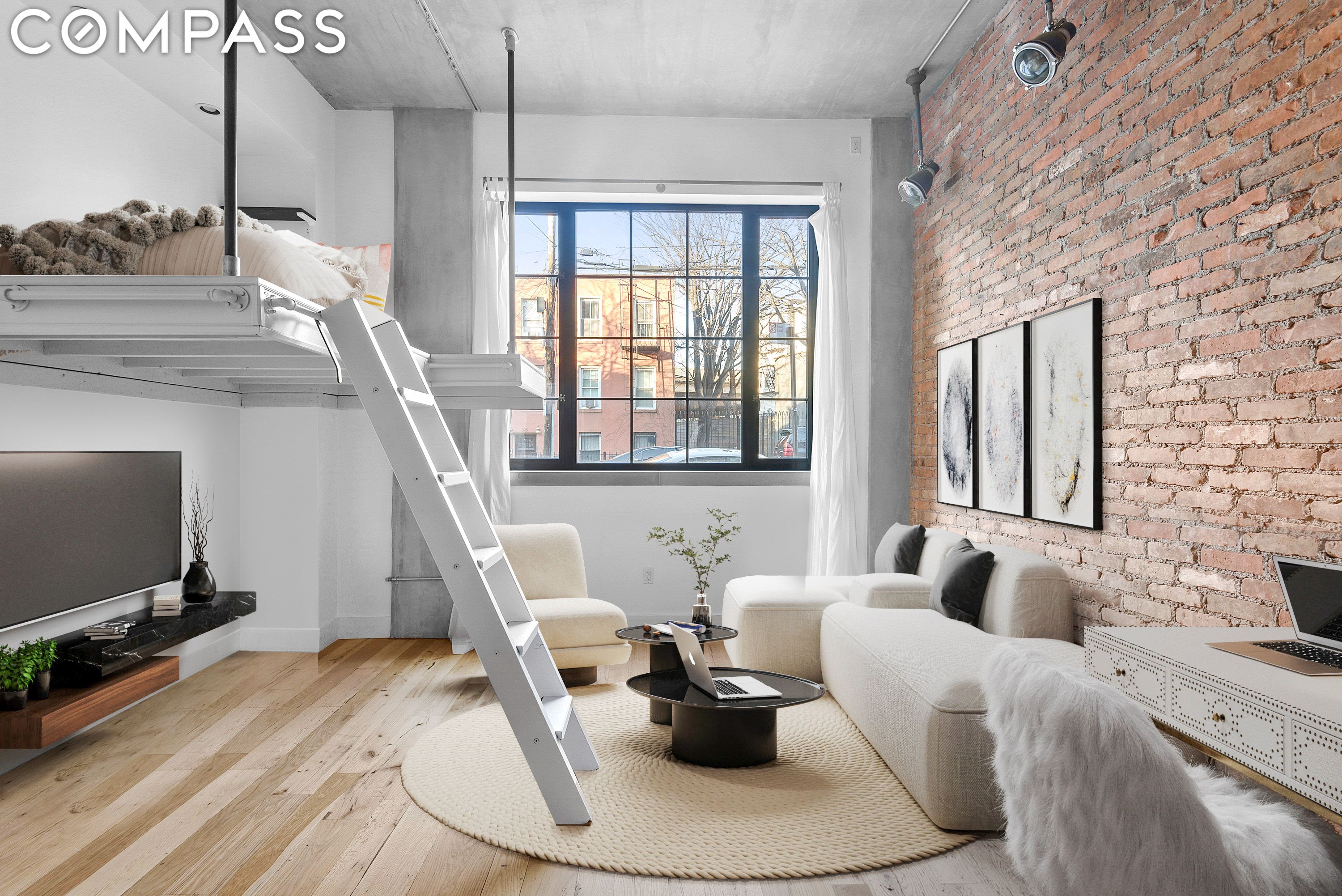 The industrial chic aesthetic is enhanced by the striking exposed brick walls and concrete details, adding character and warmth to the interior. The pristine kitchen is a modern marvel, featuring waterfall quartzite countertops and a stainless steel farm sink. The state-of-the-art appliances include a dishwasher, Bertazzoni range and chimney-style hood. The space is completed by charming open shelving against a brick backdrop.