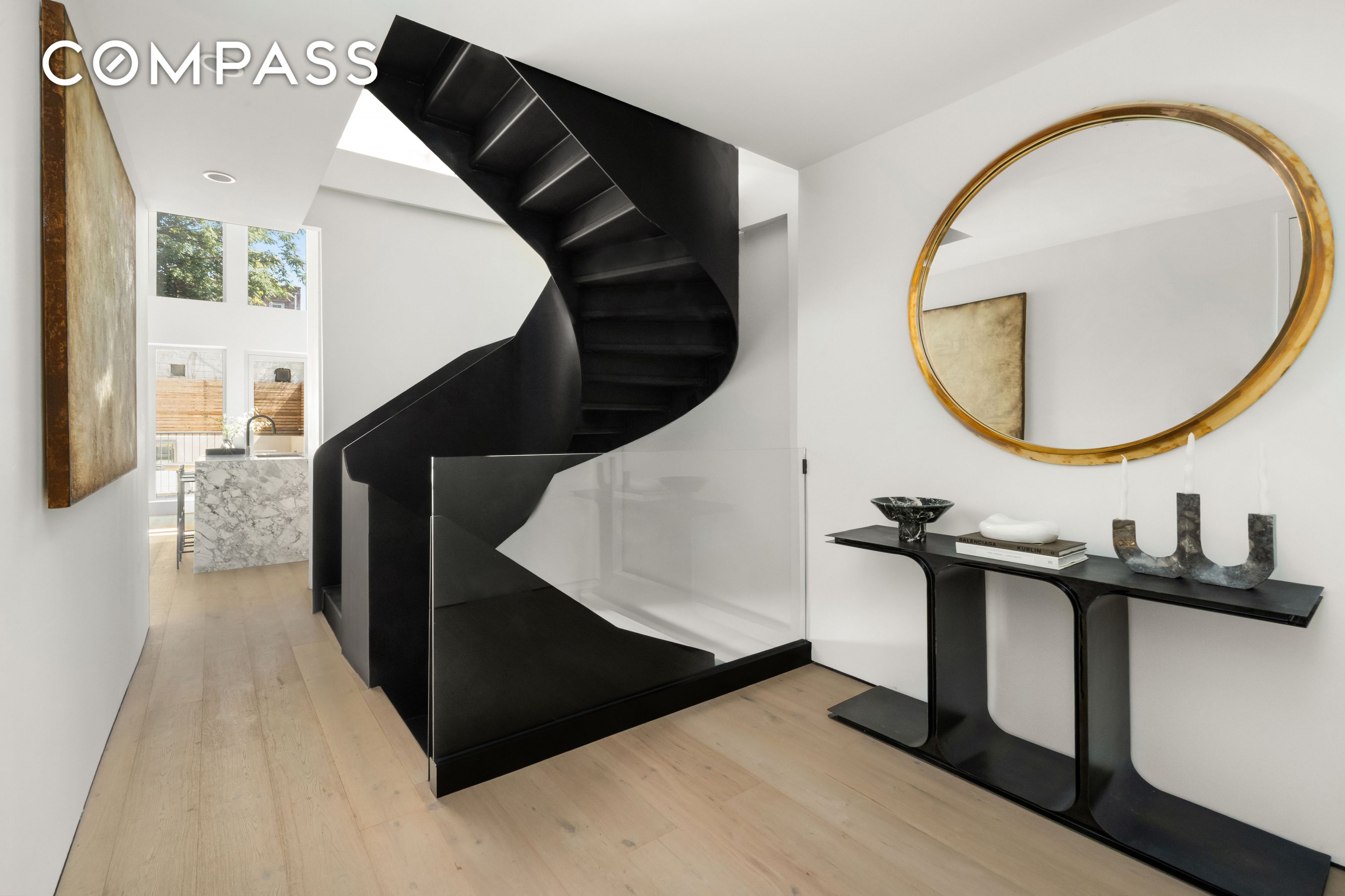 The main level is anchored by a double-height living and dining area flooded with natural light from a full wall of oversized windows. A sculptural black steel staircase creates an architectural centerpiece, connecting each level with an artful sense of flow. The open chef's kitchen pairs a striking marble waterfall island with granite countertops, custom cabinetry, and premium integrated appliances, including a Wolf range and a Liebherr fridge, creating a space that balances beauty and performance.